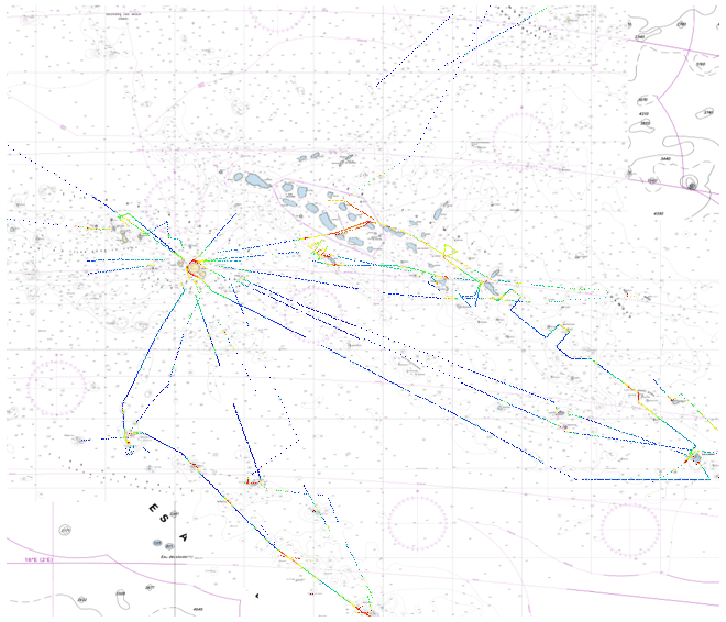 Bathymetric datasets are an extraction of surveys belonging to the Shom public database. For depth up to 50m, the vertical precision of soundings varies from 30cm to 1m and the horizontal precision varies from 1 to 20m. In deep ocean, the vertical precision is mainly around 1 or 2% of the bottom depth. It is sometimes more, it depends on the technology used. The data are referenced to ZH which is assimilated to LAT. Data are corrected for sound velocity variations. Data are acquired during the campaign S199501500 (http://dx.doi.org/10.17183/S199501500). // Instruments: sondeur raytheon // Number of soundings: 458