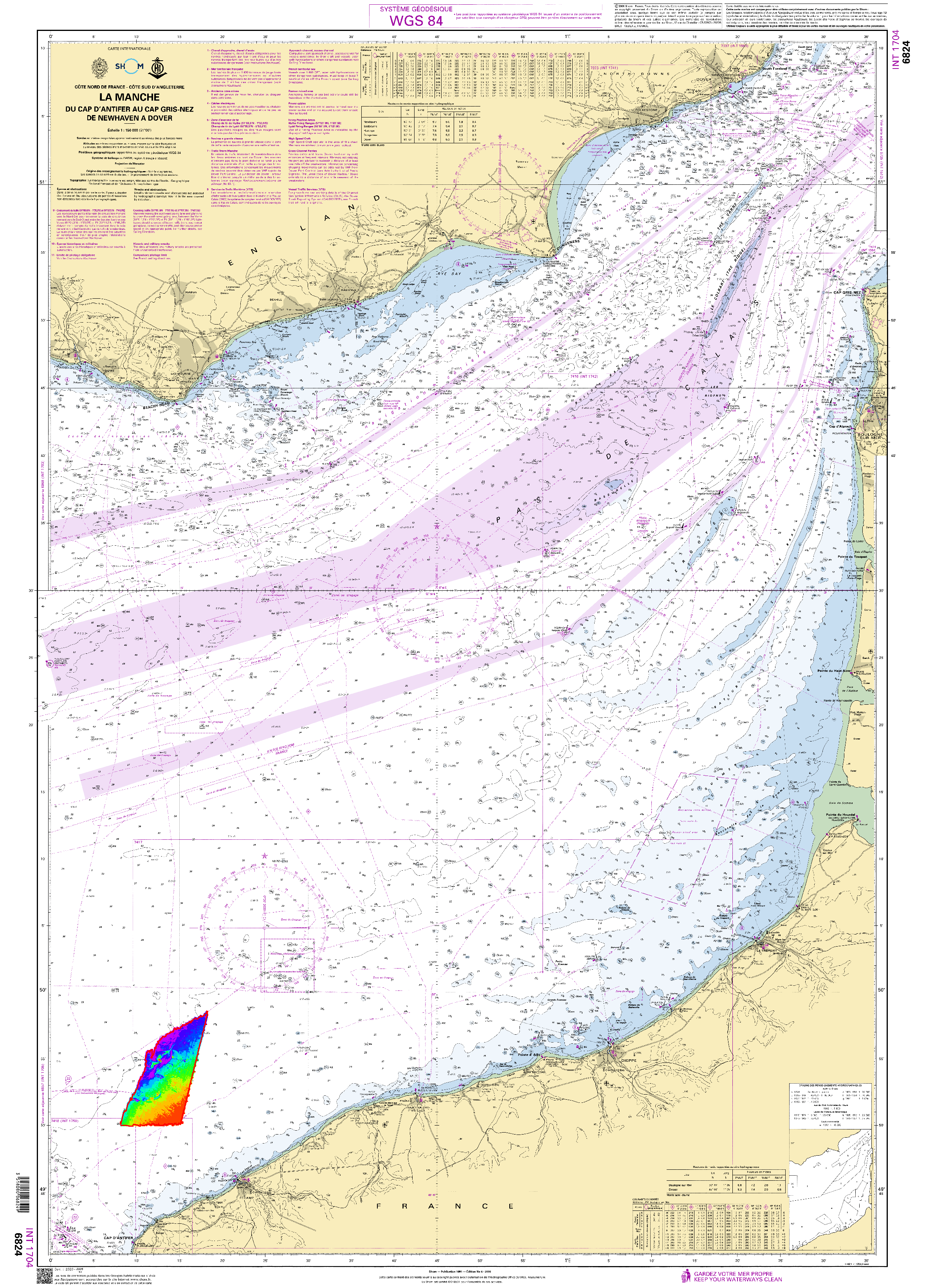 Bathymetric datasets are an extraction of surveys belonging to the Shom public database. For depth up to 50m, the vertical precision of soundings varies from 30cm to 1m and the horizontal precision varies from 1 to 20m. In deep ocean, the vertical precision is mainly around 1 or 2% of the bottom depth. It is sometimes more, it depends on the technology used. The data are referenced to ZH which is assimilated to LAT. Data are corrected for sound velocity variations. Data are acquired during the campaign S200601400 (http://dx.doi.org/10.17183/S200601400). // Instruments: sondeur multifaisceaux simrad em1002 // Number of soundings: 7153503