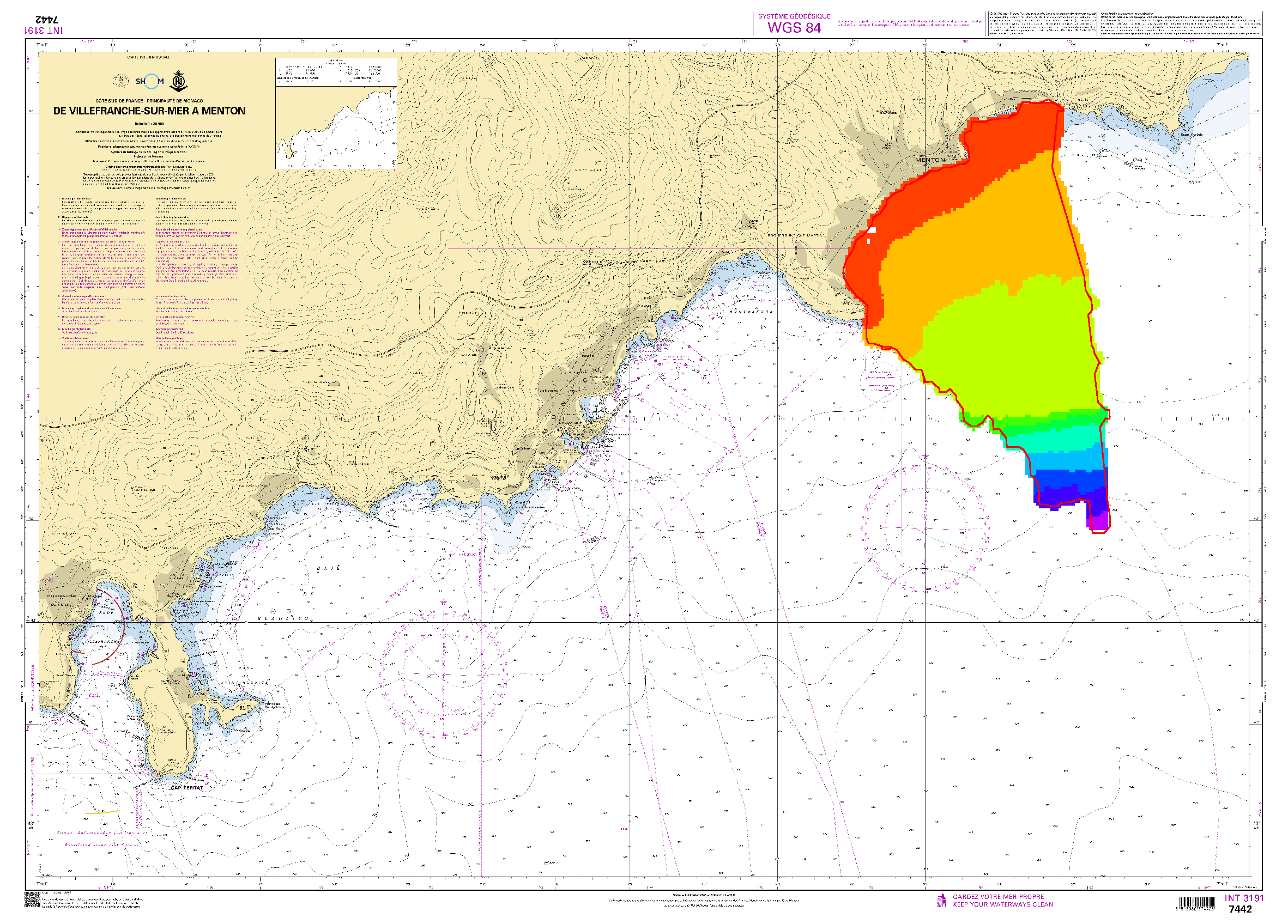 • Bathymetric datasets are an extraction of surveys belonging to the Shom public database. For depth up to 50m, the vertical precision of soundings varies from 30cm to 1m and the horizontal precision varies from 1 to 20m. In deep ocean, the vertical precision is mainly around 1 or 2% of the bottom depth. It is sometimes more, it depends on the technology used. The data are referenced to ZH which is assimilated to LAT. Data are corrected for sound velocity variations. Data are acquired during the campaign S199702300 (http://dx.doi.org/10.17183/S199702300). // Instruments: sondeur deso 20 // Number of soundings: 1832